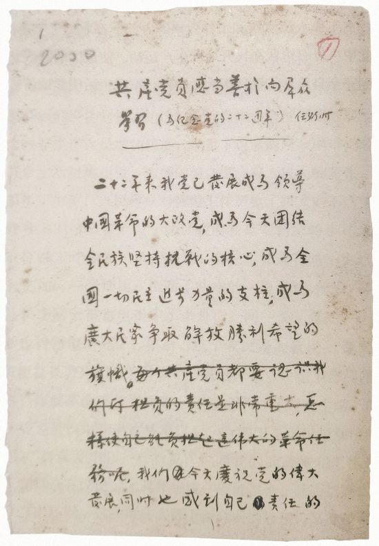 任弼时同志于1943年6月写下的《共产党员应当善于向群众学习》。中央档案馆藏