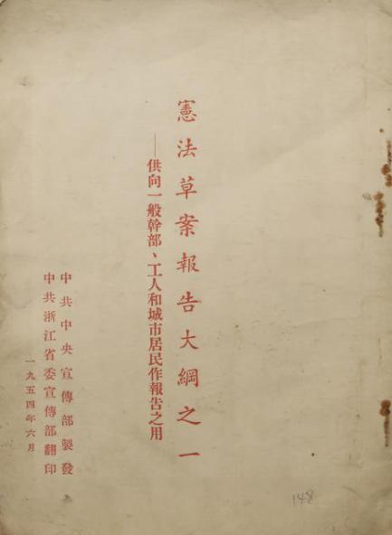 杭州是中华人民共和国第一部宪法的起草地。1953年12月28日至1954年3月14日,毛泽东主席率领宪法起草小组在西子湖畔历时77天,起草了宪法草案初稿,为1954年宪法的正式诞生奠定了重要基础。1954年6月14日宪法草案通过并公布后,全国各界开展了大规模的宪法草案讨论和宣传。让我们通过“五四宪法”历史资料陈列馆几件珍贵的展品,看看67年前宪法学习宣传工作是如何在工人中展开的。