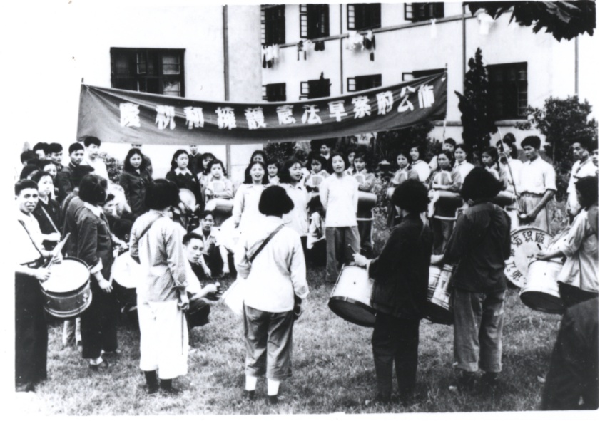 1954年,浙江麻纺织厂工人报喜队在宣传宪法草案公布