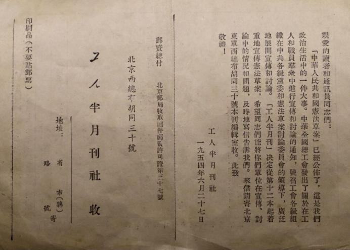 为了征集对宪法草案的意见建议,各单位不仅组织职工进行系统性的讨论、学习,还通过各类媒体征集宪法草案的宣传、讨论情况。下图展示了一张公开信,大小约为32开,是工人半月刊社在宪法草案公布后,向读者和通讯员征集他们在单位中宣传、讨论宪法草案的情况和问题。