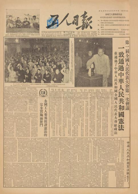 1954年9月21日,《工人日报》在头版头条刊登了宪法通过的消息
