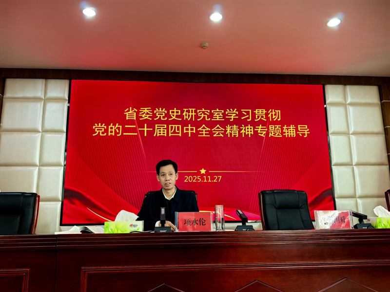 11月27日,省委党史研究室理论学习中心组举行扩大会议,深入学习贯彻党的二十届四中全会精神和省委十二届十一次全会精神。室领导班子成员,一、二级巡视员及全室干部职工参加会议。室主任项水伦作专题辅导报告,施李国、张忠诚同志分别传达有关文件精神,钟文同志主持会议。
