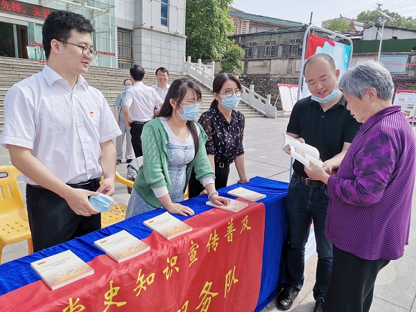 图为志愿服务队向群众赠送党史书籍并讲解黄冈历史