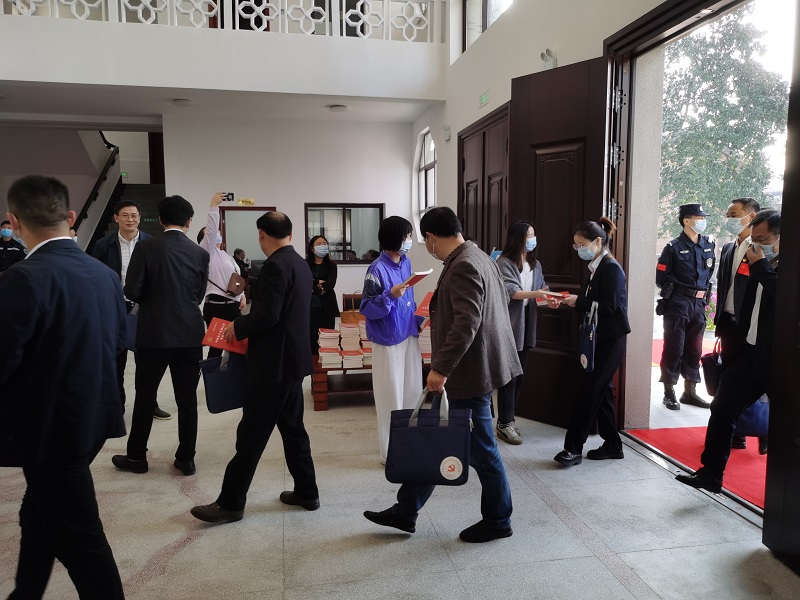 图为县史志研究中心工作人员给与会党代表发放党史第二卷