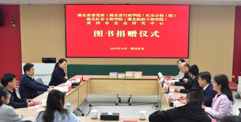 下午,江明一行到湖北红安干部学院开展图书捐赠工作。学院副院长杨勋主持捐赠仪式,并召开座谈会。江明代表中心向学院史料特藏馆捐赠中心编纂的史志书籍100余册。双方互相介绍工作情况,并就下一步深化合作交换意见,双方将在干部教育培训、课题专题研究、资源共享、党史品牌打造等方面加强深入合作。