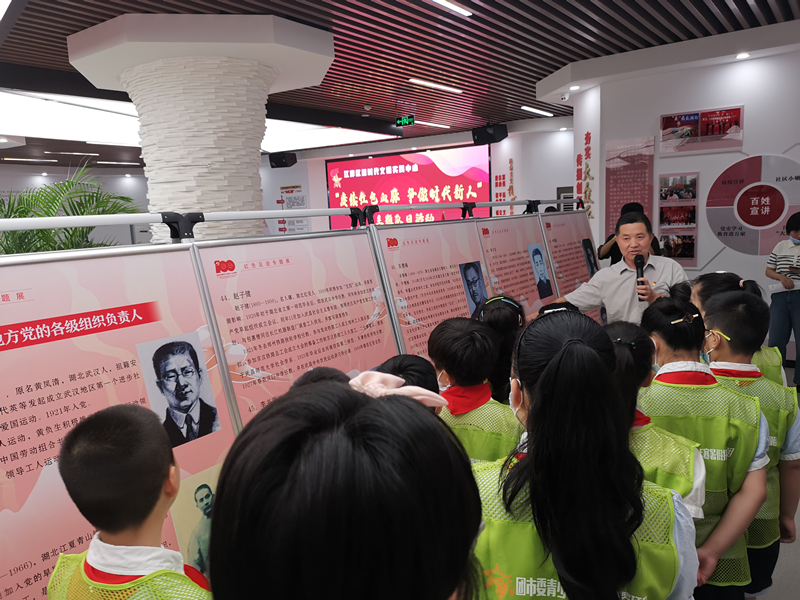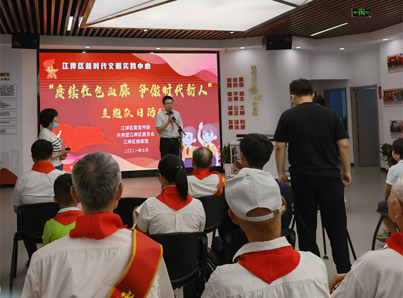 看红色江岸区百年潮涌,听老中青党员共话初心。近日,由武汉市江岸区委宣传部、团区委、区档案馆(史志研究中心)联合组织的“赓续红色血脉,争做时代新人”主题队日活动在武汉市江岸区新时代文明实践中心举行。来自汉铁小学、育才二小、京汉学校等江岸区多所小学以及暑期托管班的少先队员们,与革命后代、老党员、青年志愿者们同上一堂校外队课。