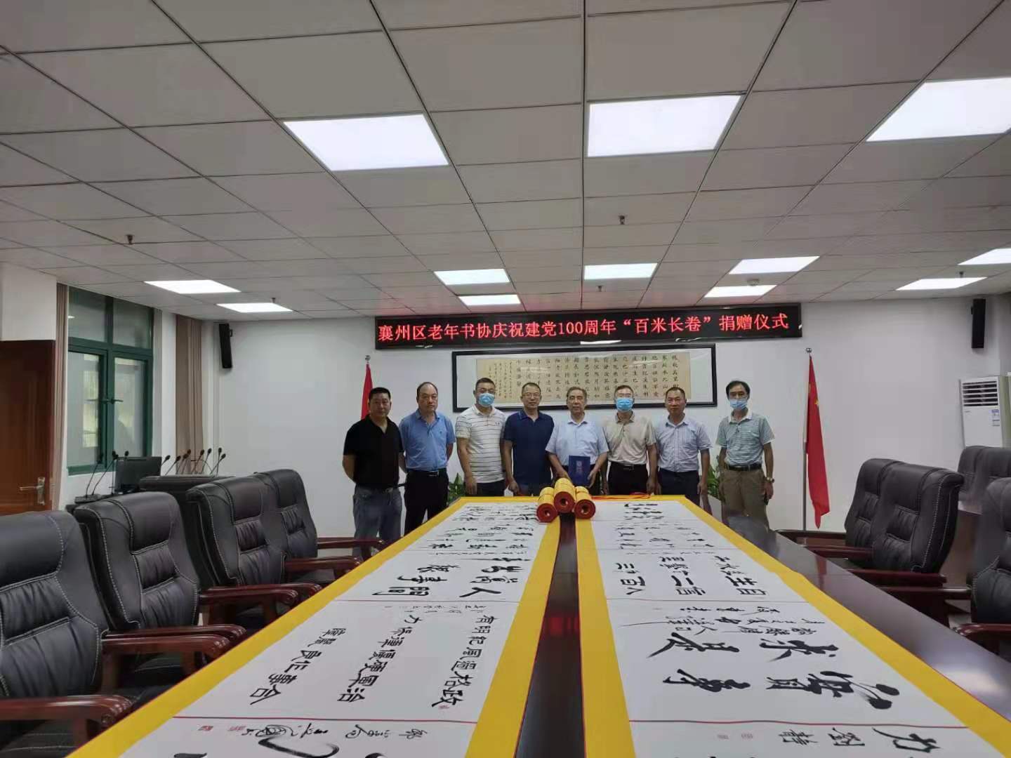 8月17日,襄阳市襄州区档案馆(史志研究中心)向区老年书画协会征集庆祝建党100周年“百米长卷”书法作品等庆祝建党百年活动档案资料。“百米长卷”书法作品由百名书法爱好者共同完成,以宣传“学党史、铭初心、感党恩、书新篇”为主题,书写毛泽东、邓小平、江泽民、胡锦涛、习近平五位领袖对中国共产党建设的重要论述,形成100米长卷。征集捐赠仪式由襄州区区委组织部副部长、区委老干部局局长王云峰主持,区档案馆馆长吕荣波代表襄州区档案馆为襄州区老年书画协会颁发了馆藏证书,表达了感谢和敬意。