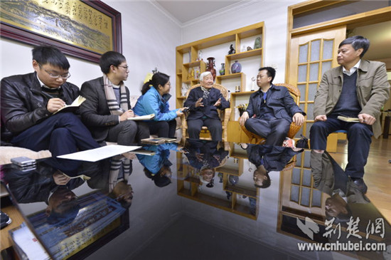 记者们在武钢集中采访沈老的老同事齐金堂 记者张城摄