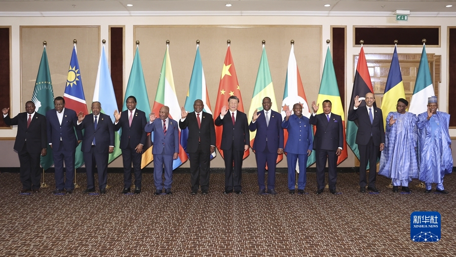 非盟轮值主席、科摩罗总统阿扎利,中非合作论坛非方共同主席国、塞内加尔总统萨勒,非洲次区域组织代表赞比亚总统希奇莱马、布隆迪总统恩达伊施米耶、吉布提总统盖莱、刚果(布)总统萨苏、纳米比亚总统根哥布、乍得总理凯布扎博、利比亚总统委员会副主席库尼、尼日利亚副总统谢蒂马,以及非盟委员会代表穆昌加等出席。这是会前集体合影。新华社记者 黄敬文 摄
