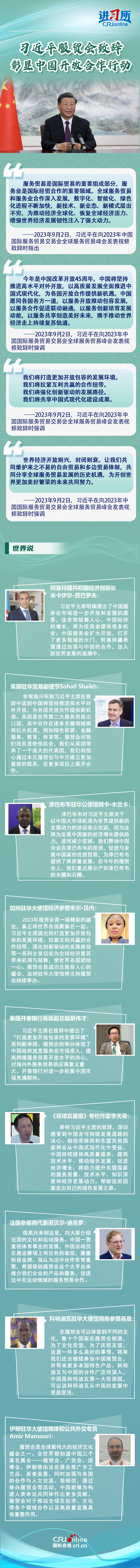 【本期导读】9月2日,2023年中国国际服务贸易交易会在北京开幕,80余个国家和国际组织设展办会,2400余家企业线下参展。当天上午,中国国家主席习近平向本次服贸会全球服务贸易峰会发表视频致辞,就以服务推动世界经济走上持续复苏轨道宣布一系列举措,彰显中国开放合作的行动。