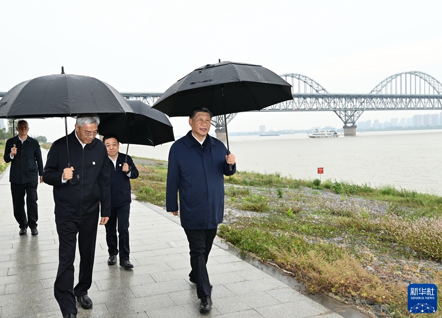 10月10日至13日,中共中央总书记、国家主席、中央军委主席习近平在江西考察。这是10日下午,习近平在长江国家文化公园九江城区段考察时,冒雨沿江堤步行察看沿岸风貌。新华社记者 谢环驰 摄
