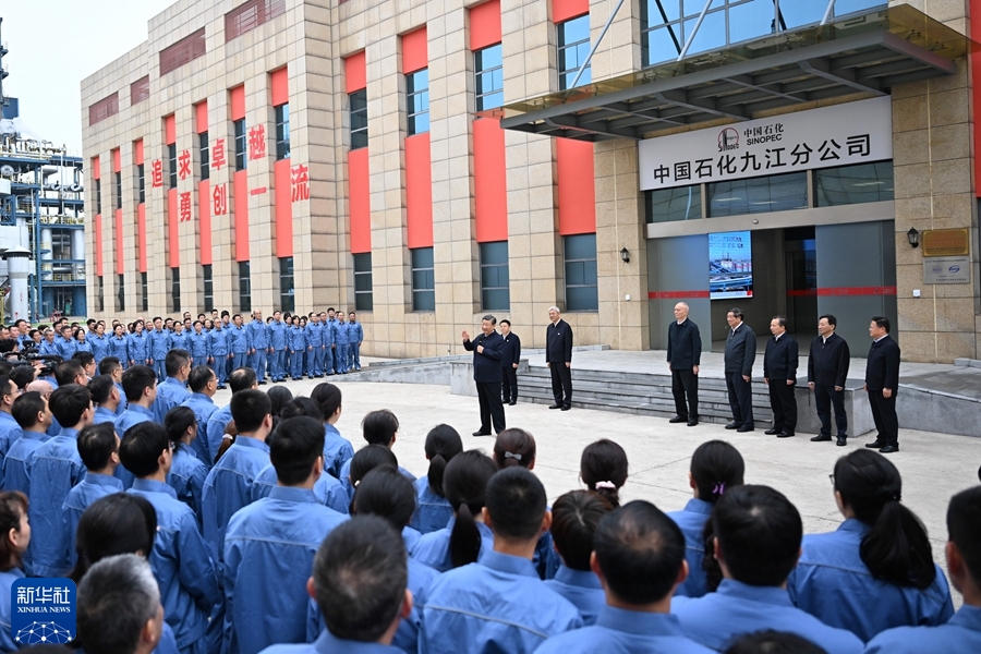 习近平随后乘车来到中国石化九江分公司。他走进公司生产管控中心控制大厅和检验计量中心实验室,详细了解企业转型升级打造绿色智能工厂、推动节能减污降碳等情况,对企业开展科学检测、严格排放标准等做法表示肯定。习近平强调,破解“化工围江”,是推进长江生态环境治理的重点。要再接再厉,坚持源头管控、全过程减污降碳,大力推进数智化改造、绿色化转型,打造世界领先的绿色智能炼化企业。