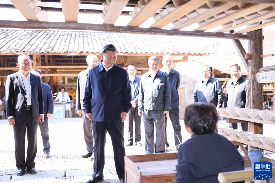 10月10日至13日,中共中央总书记、国家主席、中央军委主席习近平在江西考察。这是11日上午,习近平在景德镇市陶阳里历史文化街区考察时,同非遗传承人等亲切交流。新华社记者 谢环驰 摄