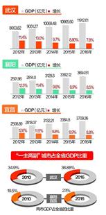 “整个湖北的经济,武汉一城独大的现象特别突出,从2003年开始,武汉占全省GDP比重就一直在30%以上。”武汉大学经济与管理学院教授邹薇表示,仅武汉“一家独大”,不利于全省经济的均衡发展。正是在这样的背景下,2011年,我省“十二五”规划纲要中正式提出:“坚持以武汉为全省主中心城市,襄阳、宜昌为省副中心城市的‘一主两副’总体格局。”