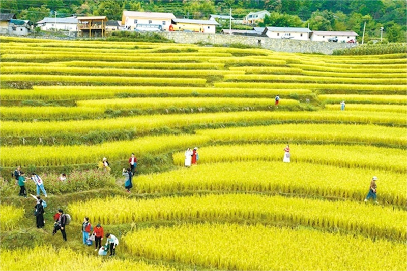 9月25日,游客在秭归县沙镇溪镇长春村高山冷水稻基地游览,金黄的冷水稻与传统民居交相辉映,美丽乡村“丰”景如画。2022年以来,秭归县聚焦聚力开展“美丽集镇、美丽乡村、美丽庭院”同建工作,将共同缔造理念贯穿“三个最美”建设全过程。(视界网 郑家裕 摄)