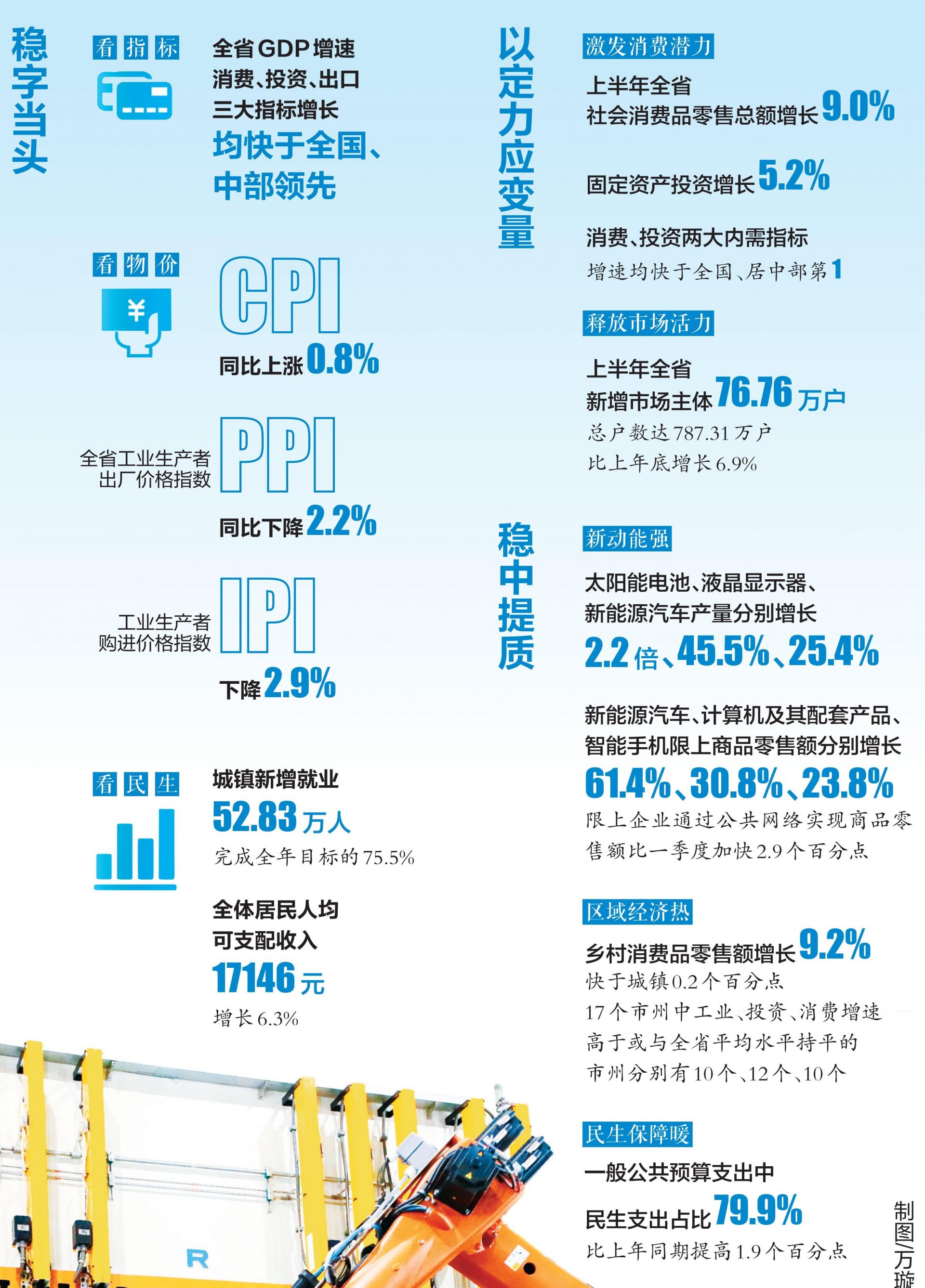 多措并举扩内需。上半年全省社会消费品零售总额增长9.0%,固定资产投资增长5.2%。消费、投资两大内需指标增速均快于全国、居中部第1。