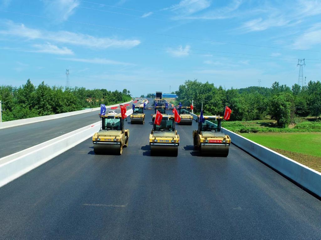 7月10日,武汉至阳新高速公路陈贵互通路段,智能无人化摊铺设备正在作业。(王鹏 摄)
