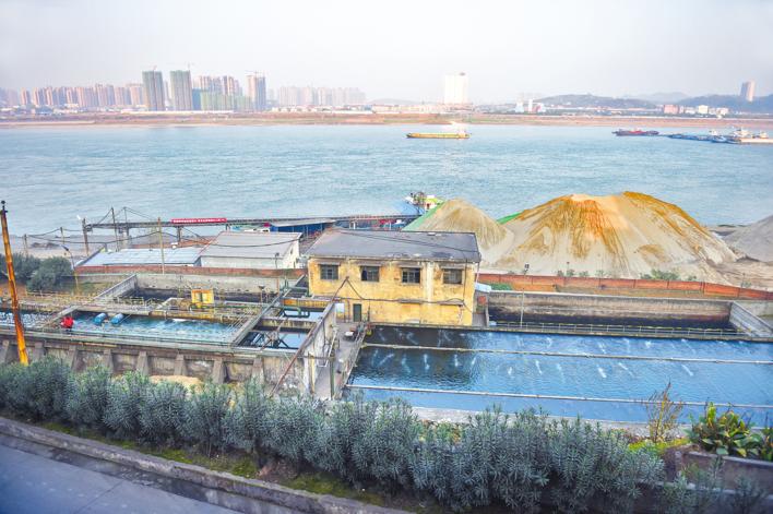 生态修复前 2016年12月,宜昌长江边的污水处理厂与砂石堆场林立。(湖北日报全媒记者 刘曙松 摄)