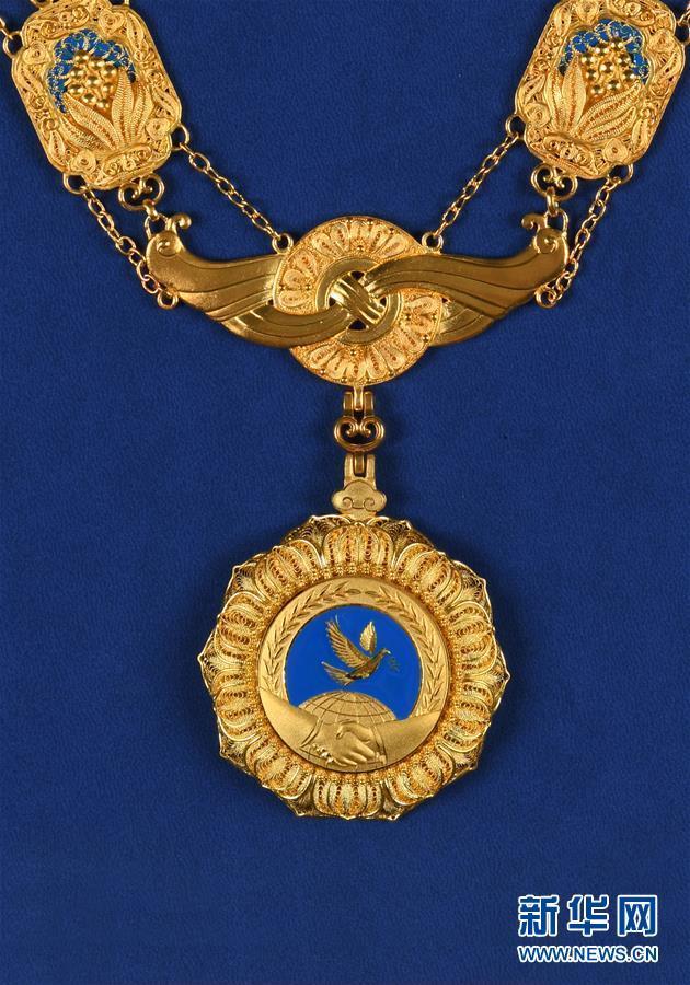 中华人民共和国“友谊勋章”章体以金色、蓝色为主色调,采用和平鸽、地球、握手、荷花等元素,章链采用中国结、万年青、牡丹花、玉璧、兰草等元素,整体采用花丝镶嵌、掐丝珐琅等传统工艺手工制作。设计制作象征中国人民同各国人民友好团结、友谊长存,祝愿世界各国共同繁荣发展。