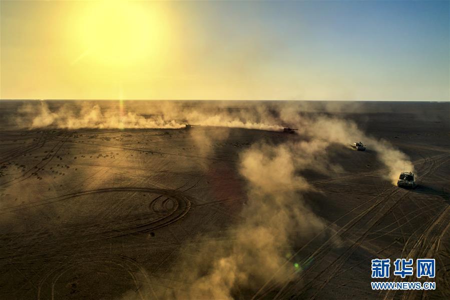 东部战区陆军某海防旅炮兵分队在西北大漠组织实弹射击演练,自行火炮进行战场机动(7月23日摄)。新华社发(周寅 摄)