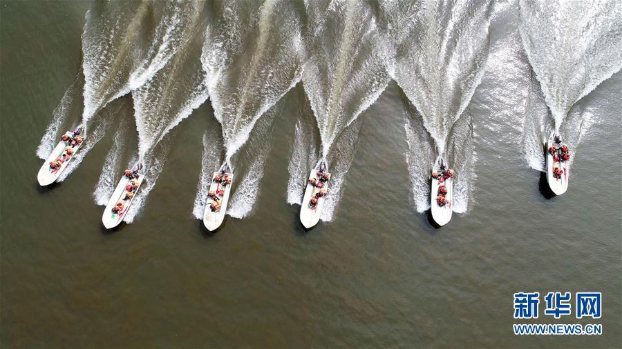 武警福建省总队龙岩支队水上救援演练在汀江上杭某水域展开,官兵驾驶冲锋舟进行水中编队演练(4月25日摄)。新华社发(李涛 摄)