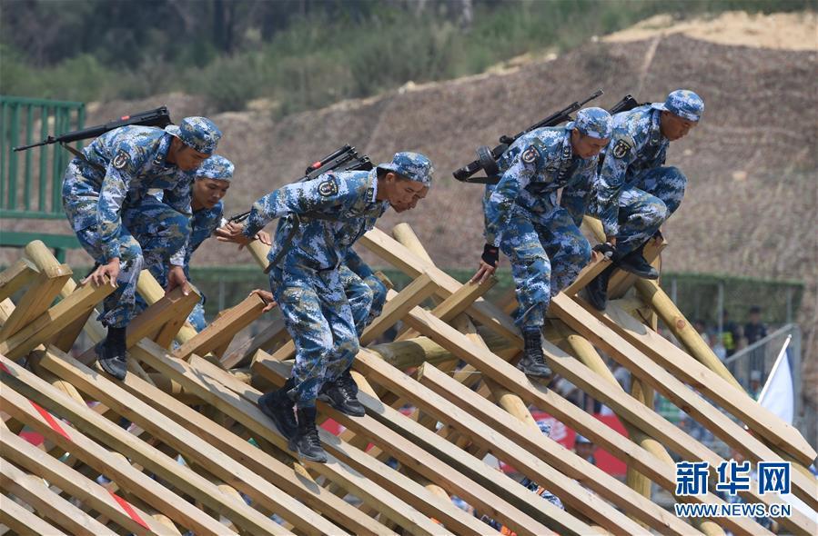 中国参赛队员在“国际军事比赛-2018”海上登陆赛障碍赛中通过树干鹿砦(7月30日摄)。 新华社记者 姜克红 摄