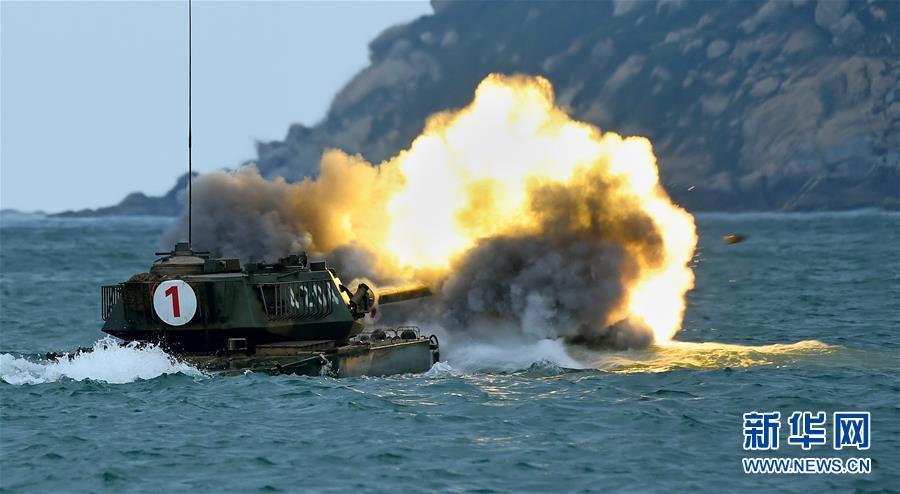 陆军第73集团军某旅在东海某海域组织两栖坦克实弹射击(5月7日摄)。 新华社发(何生 摄)