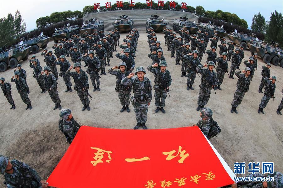 演习出征前,陆军某部红一连官兵面向连旗宣誓(6月20日摄)。 新华社发(胡善雨 摄)