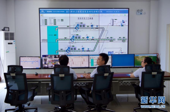 8月5日,工作人员在福建向金门供水工程晋江龙湖取水泵站中控室内监视设备运行情况。 当日上午,福建向金门供水工程实现正式通水。福建向金门供水工程由晋江龙湖取水泵站、陆地输水管道和跨海输水管道三部分组成,线路总长约28公里,设计流量3.4万立方米/日,工程总投资3.88亿元人民币,水费按9.86元新台币/立方米计价。 新华社记者姜克红摄