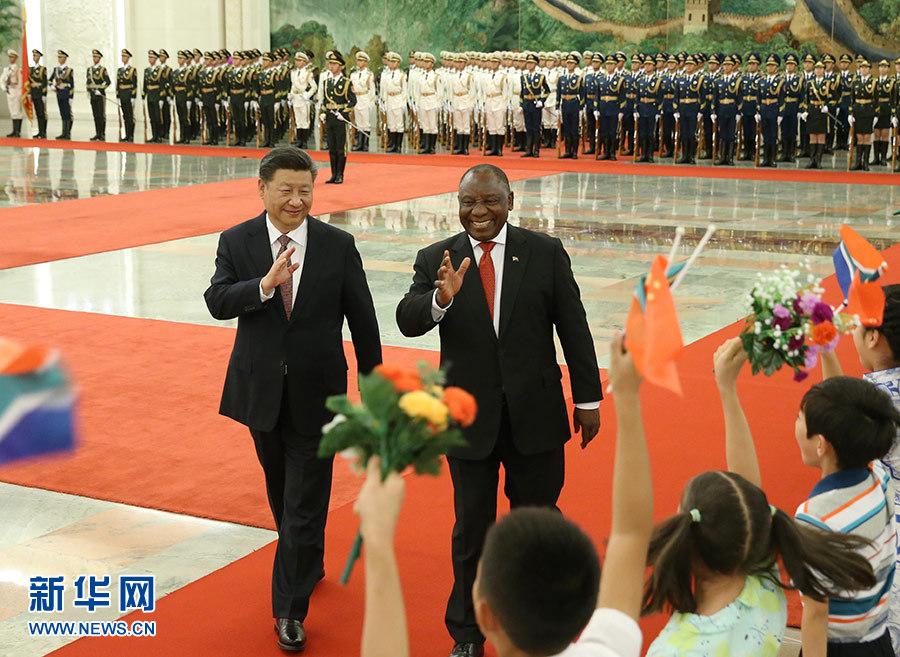9月2日,国家主席习近平在北京人民大会堂同南非总统拉马福萨举行会谈。这是会谈前,习近平在人民大会堂北大厅为拉马福萨举行欢迎仪式。 新华社记者 姚大伟 摄