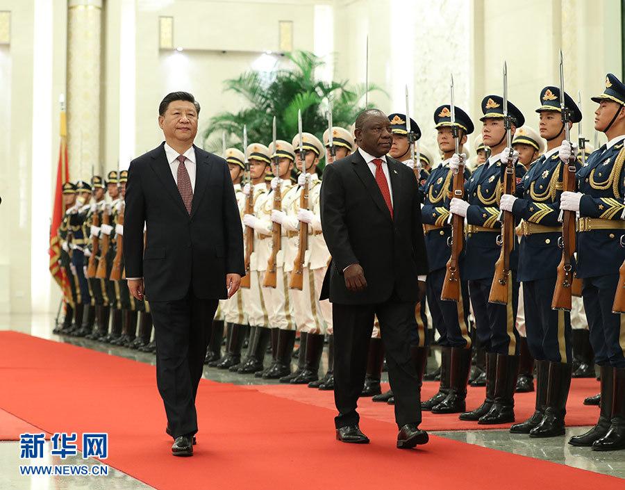 9月2日,国家主席习近平在北京人民大会堂同南非总统拉马福萨举行会谈。这是会谈前,习近平在人民大会堂北大厅为拉马福萨举行欢迎仪式。 新华社记者 王晔 摄