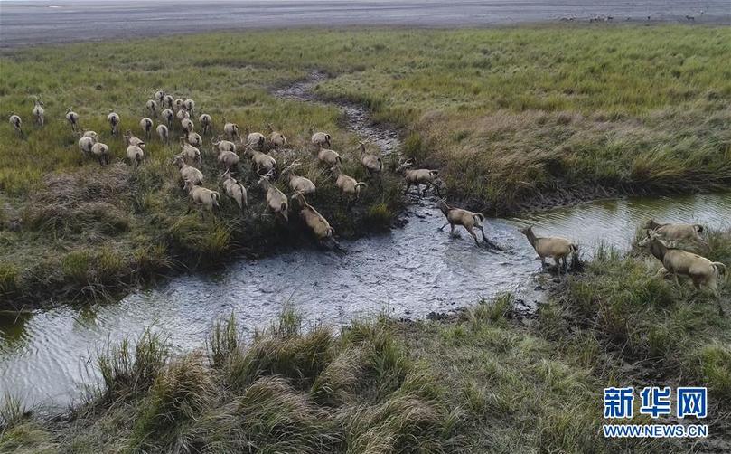 这是2017年11月14日在江苏大丰麋鹿国家级自然保护区拍摄的麋鹿(无人机拍摄)。新华社记者 季春鹏 摄