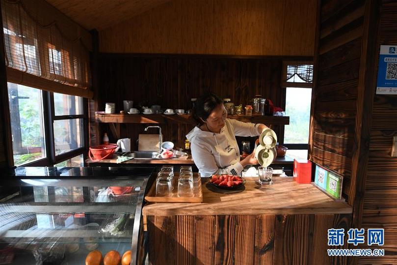 工作人员在无锡宜兴白塔村内的一间茶室招待游客(2018年4月2日摄)。 新华社记者 季春鹏 摄