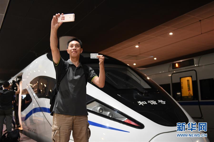 2018年9月23日,广深港高铁全线开通,一名搭乘G5711次高铁列车前往香港西九龙站的乘客在深圳北站拍照留念。 新华社记者 毛思倩 摄
