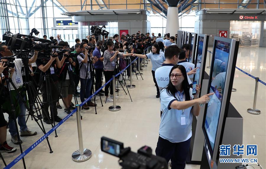 2018年10月19日,在香港口岸旅检大楼,工作人员在穿梭巴士自助售票机前演示购票过程。 新华社记者 李钢 摄