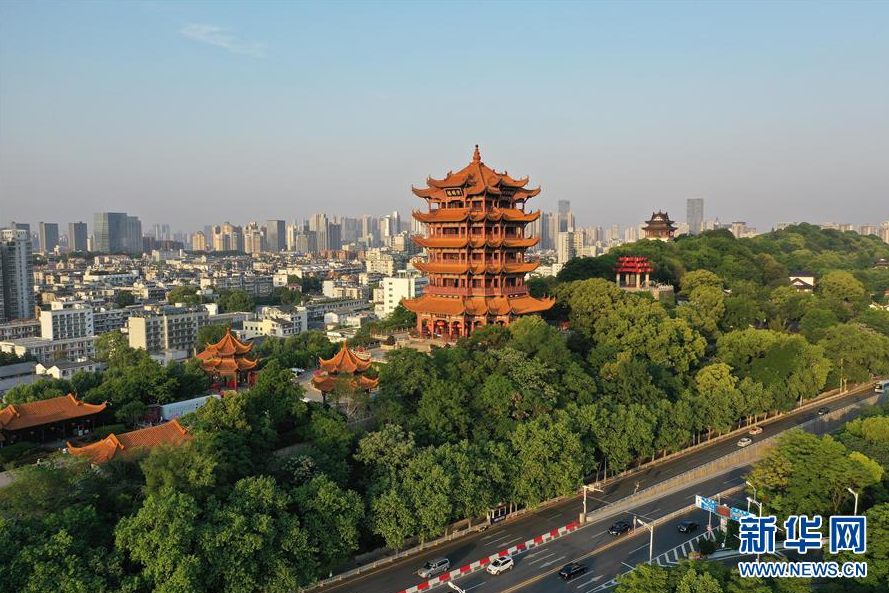 4月28日拍摄的即将恢复开放的武汉黄鹤楼景区(无人机照片)。 4月29日,武汉黄鹤楼景区将重新开放,每天限流5400人次,目前只开放室外区域,全封闭区域暂不开放。游客入园前要扫描健康码并进行体温测量,佩戴口罩入园游览。 新华社发(赵军 摄)