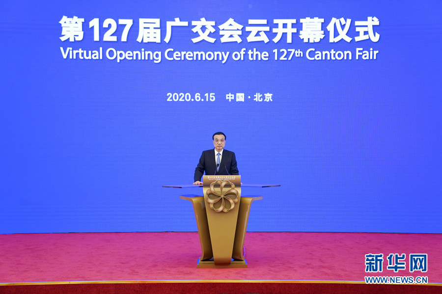 6月15日,中共中央政治局常委、国务院总理李克强在北京出席第127届广交会“云开幕”仪式。 新华社记者 张领 摄