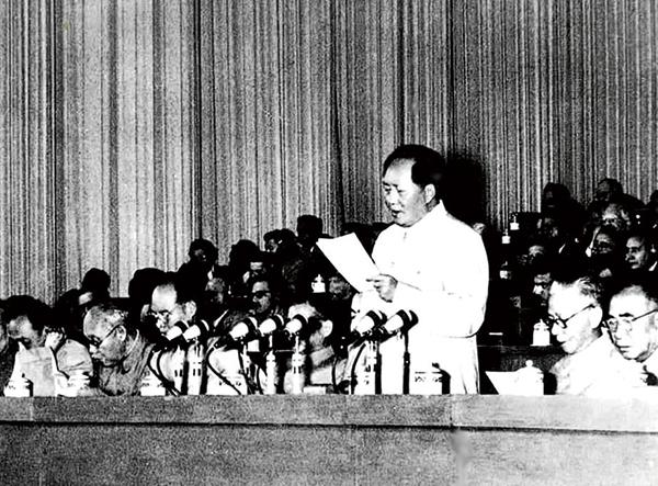 1956年9月15日至27日,中国共产党第八次全国代表大会在北京举行。大会提出的党和国家主要任务是集中力量发展生产力的思想,对于社会主义事业的发展和党的建设具有长远的重要的意义。图为毛泽东在大会上致开幕词。新华社发