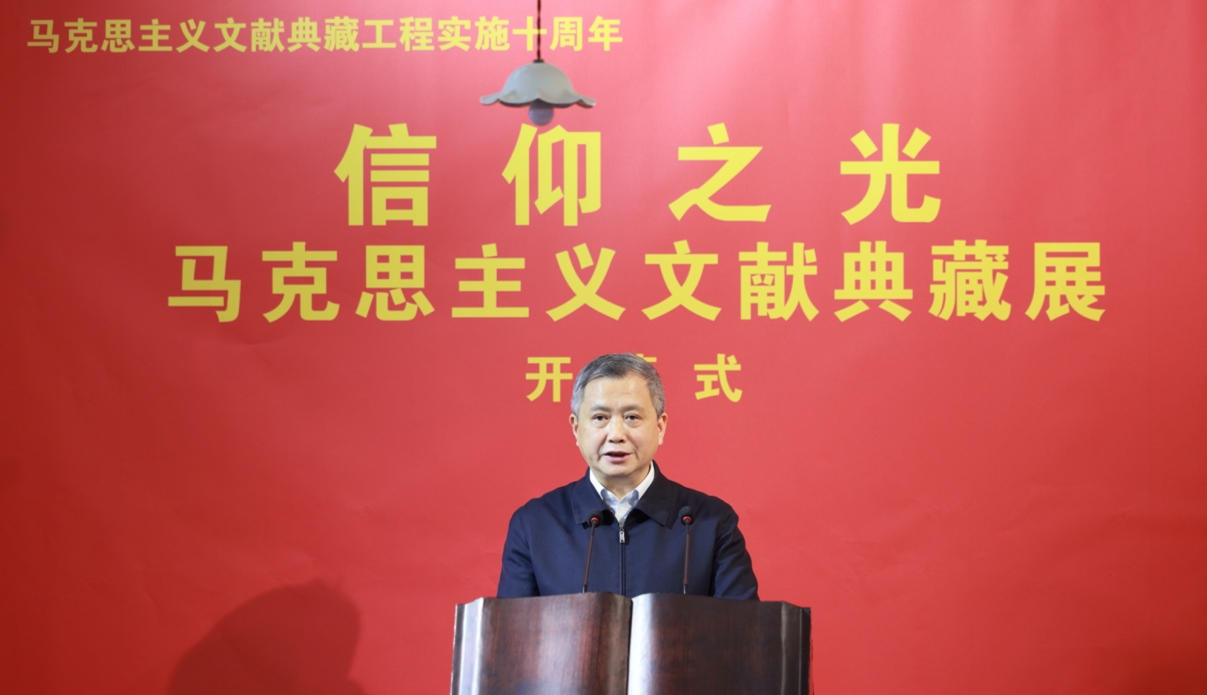 曲青山在致辞中指出,马克思主义文献承载着马克思主义经典作家对人类解放事业的不懈追求,闪耀着跨越时空的真理光辉,是人类社会宝贵的精神财富,是深入学习研究马克思主义理论的源头活水。举办这次展览,目的就是以“两个结合”为鲜明主题,呈现马克思恩格斯手稿和藏书的珍贵与震撼,还原马克思主义经典著作的创作和传播过程,深刻揭示“两个结合”重大命题的思想脉络和实践历程,教育引导广大党员干部群众深刻感悟马克思主义的真理力量,坚持不懈用习近平新时代中国特色社会主义思想凝心铸魂,汇聚起以中国式现代化全面推进强国建设、民族复兴伟业的磅礴伟力。党史和文献工作是党的事业的重要组成部分。为党“传经布道”、编修“红色家谱”,是中央党史和文献研究院的职责使命。新征程上,我们必须坚持以习近平新时代中国特色社会主义思想为指导,全面贯彻党的二十大和二十届二中、三中全会精神,深入学习贯彻习近平文化思想,扎根中国大地、赓续中华文脉、厚植学术根基,不断开创党史和文献工作高质量发展新局面,为推进马克思主义中国化时代化作出更大贡献!