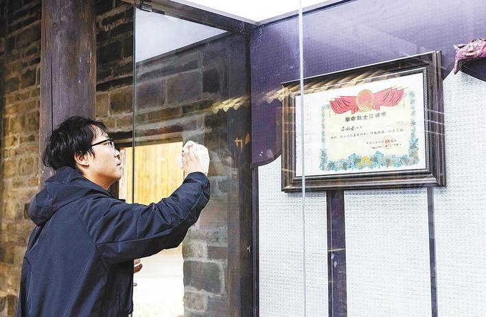 漆黎明擦拭橱窗,精心维护太爷爷漆承芳的革命烈士证明书。(湖北日报全媒记者 薛婷 摄)