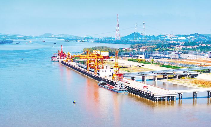 10月23日,武穴港区多式联运工程综合码头雏形已现,部分泊位正在带货调试。记者 薛婷 摄