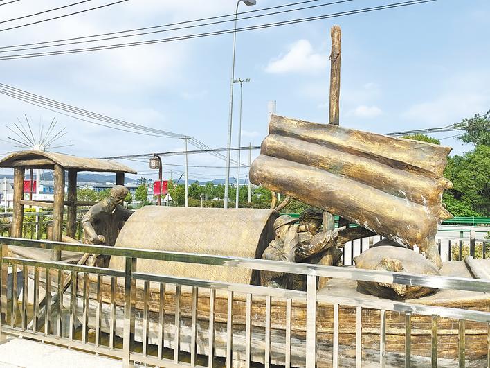 雕塑中,奋力摇桨护送八路军过江的艄公,就是贾道明。记者 柯利华 摄