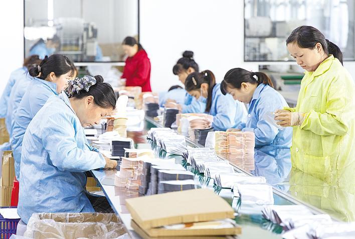 蕲春县漕河镇一家蕲艾企业生产车间里,女工们正在制作蕲艾护足暖贴。记者 成熔兴 摄