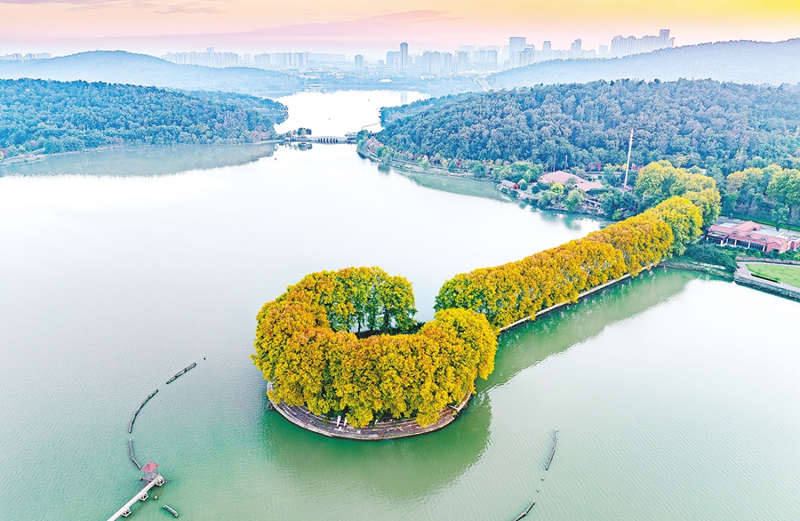 11月4日,航拍武汉东湖风景区“金钥匙”。从空中俯瞰,这把由自然与时间共同雕琢的“金钥匙”,在深秋的暖阳下熠熠生辉。(湖北日报全媒记者柯皓摄)