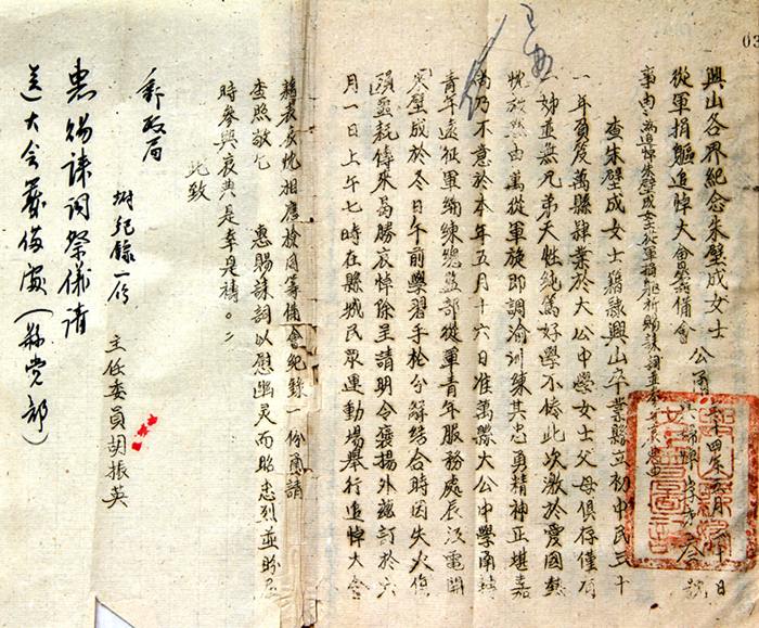 兴山各界纪念朱壁成女士从军捐躯追悼大会筹备会公函