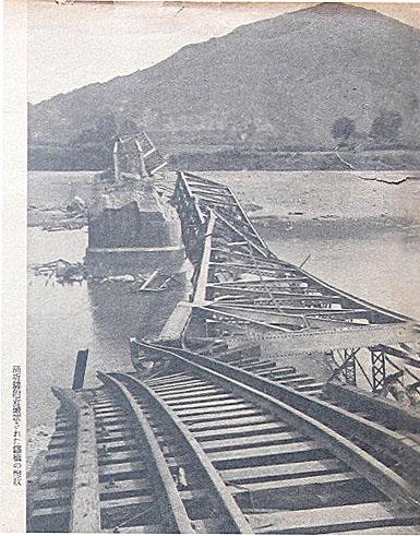 粤汉铁路线蒲圻陆水河大桥被炸毁远眺图。陆水河右岸即为蒲圻县城。