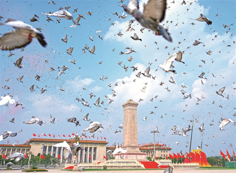 9月3日,纪念中国人民抗日战争暨世界反法西斯战争胜利80周年大会在北京隆重举行。图为纪念大会现场放飞鸽子。新华社记者牟宇摄