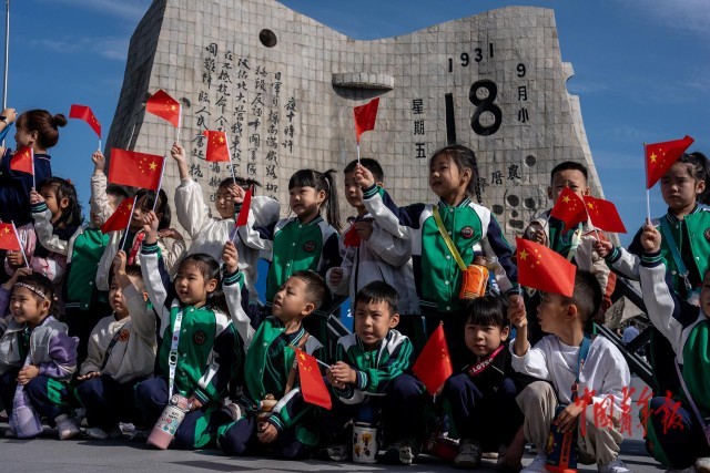 9月17日,辽宁省沈阳市“九·一八”历史博物馆,前来参观展览的小朋友们在残历碑前挥舞国旗,准备合影留念。随着“九一八事变”纪念日临近,辽宁省沈阳市“九·一八”历史博物馆迎来参观客流高峰。