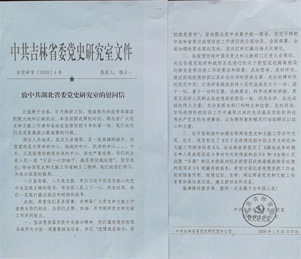 湖北省新冠肺炎疫情一直牵动着中央党史和文献研究院及兄弟省市区党史文献部门各级领导和广大同仁的心。中央党史和文献研究院曲青山院长对此高度关注,召集专门会议,专题研究疫情防控和支援救助工作,并以单位名义于1月27日给我室发来慰问信,向奋战在疫情防控斗争第一线的湖北省广大党史和文献工作者表示诚挚问候,鼓励大家再接再厉,积极投身疫情防控和群防群治,表示将尽全力提供力所能及的帮助和支持,为打赢疫情防控阻击战作出党史人的贡献。贵州、河北、山东、吉林、湖南、内蒙古、江西、新疆、河南、浙江等地省委党史文献研究室,也纷纷来电来函声援湖北抗击疫情,让我们感受到“一方有难、八方支援,同舟共济、共克时艰”的亲情关怀,增添了力量,激发了斗志。