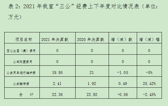 从上下年决算对比分析,2021年我室“三公”经费决算数为22.36万元,较上年的22.92万元减少0.56万元,减幅2.45%。其中,因公出国(境)费用0万元,与上年一致;公务用车购置费0万元,与上年一致;公务用车运行维护费19.95万元,较上年的21万元减少了1.05万元,减幅5%;公务接待费2.41万元,较上年的1.92万元增加0.49万元,增幅25.42%。总体上看,我室的“三公”经费使用比上年有所减少,符合我省“三公”经费管理统一要求。(见表2)